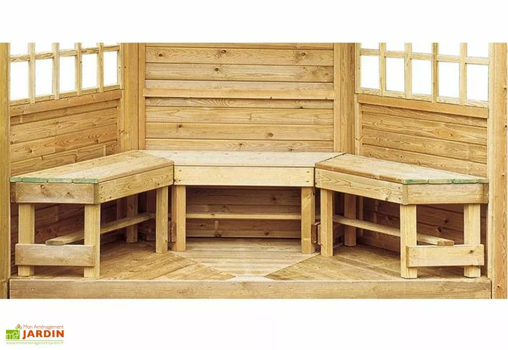 Chaque banc mesure 109 cm de large pour 43 cm de haut et 39 cm de profondeur. En bois d’épicéa imprégné par immersion, ils ne demandent aucun entretien particulier car ils bénéficient d’un traitement contre la moisissure et les insectes. Ils se marieront parfaitement à l’aménagement de votre kiosque, en faisant un espace de réception agréable.