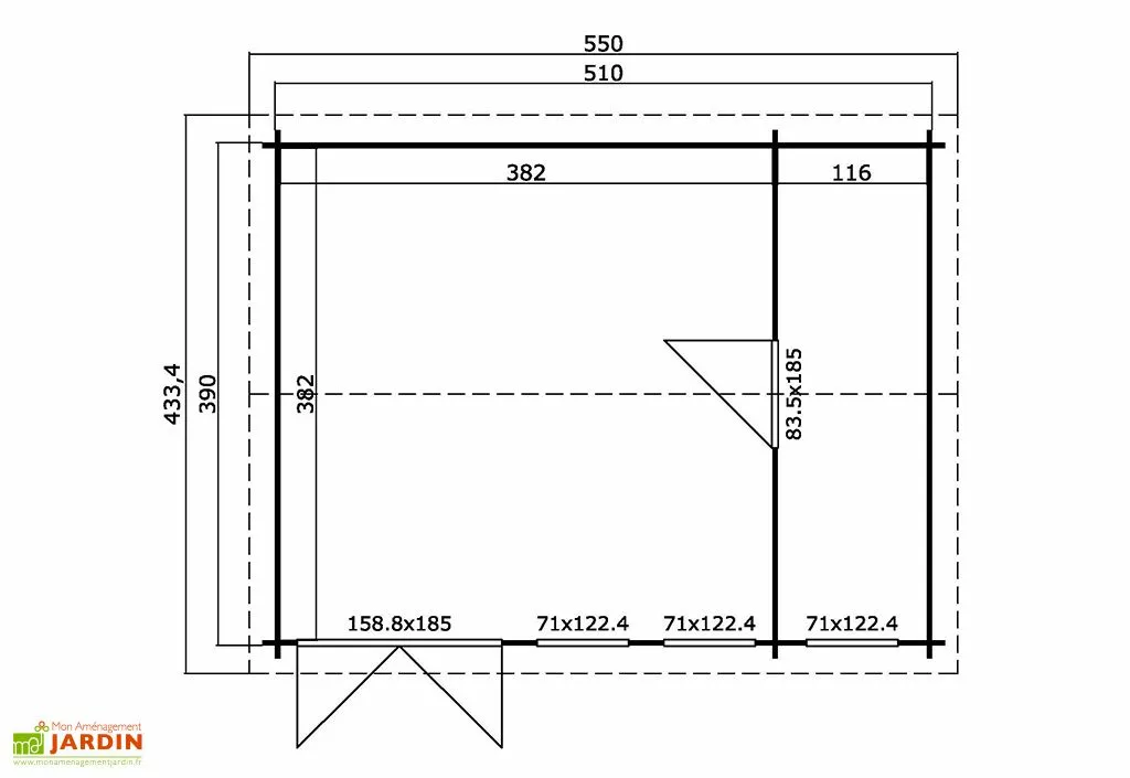 - Hors tout : 433,4 x 550 cm (l,L) – 23,8 m²