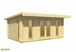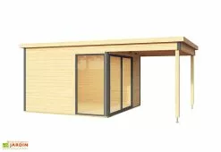 Les parois de cet abri en bois, hautes de 2,05 m, sont constituées de madriers de 40 mm d’épaisseur qu’il vous faudra assembler. Le plancher, ainsi que le revêtement de la toiture (feutre bitumé) sont également inclus. Une double porte vitrée et deux doubles fenêtres oscillo-battantes avec vitrage en verre trempé apporteront quant à elles un peu de luminosité à l’intérieur de l’abri.