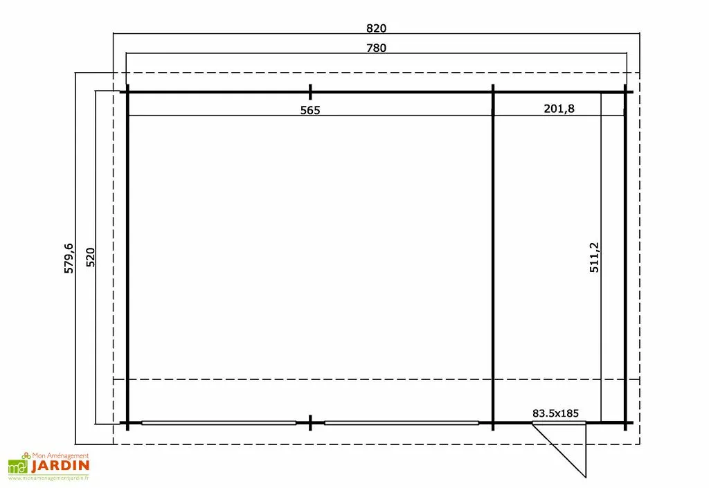 - Espace intérieur partie remise : 201,8 x 511,2 cm (L,l) – 10,3 m²
