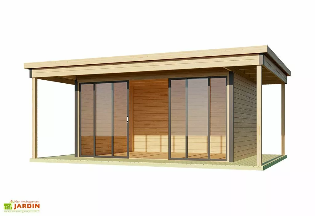 L’abri de jardin est fabriqué en bois d’épicéa brut, qu’il sera nécessaire de traiter contre la moisissure et les insectes xylophages avec un traitement fongicide et insecticide. Les madriers à emboiter qui le composent facilitent grandement le montage. Des protections d’angle en aluminium gris anthracite, un toit plat, une terrasse couverte et des baies vitrées viennent renforcer le design contemporain de ce studio de jardin.