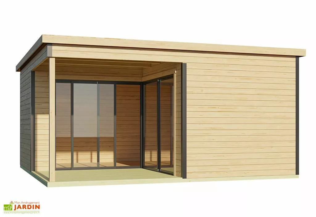 Le design moderne du chalet de jardin habitable est renforcé par la présence d’un toit plat, de 2 grandes baies vitrées, de protection d’angles en aluminium anthracite et de sa construction en angle.
