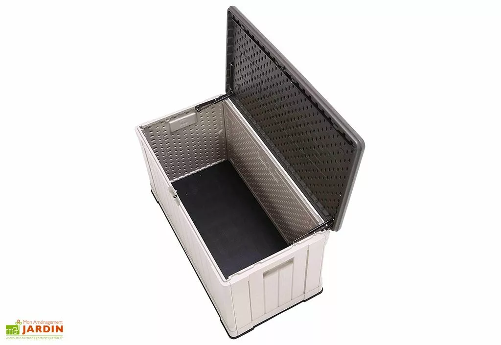 Ce coffre de jardin en résine est équipé d’un couvercle doté de charnières à ressort, pour une ouverture et une fermeture à la fois facile et sûre. Ce couvercle pourra être verrouillé, pour plus de sécurité (cadenas non inclus). Le tout est par ailleurs tellement solide que le coffre pourra très bien être utilisé comme un banc, en dépannage lors d’un repas en extérieur par exemple. Ce coffre est également doté de poignées lui permettant d’être déplacé aisément.