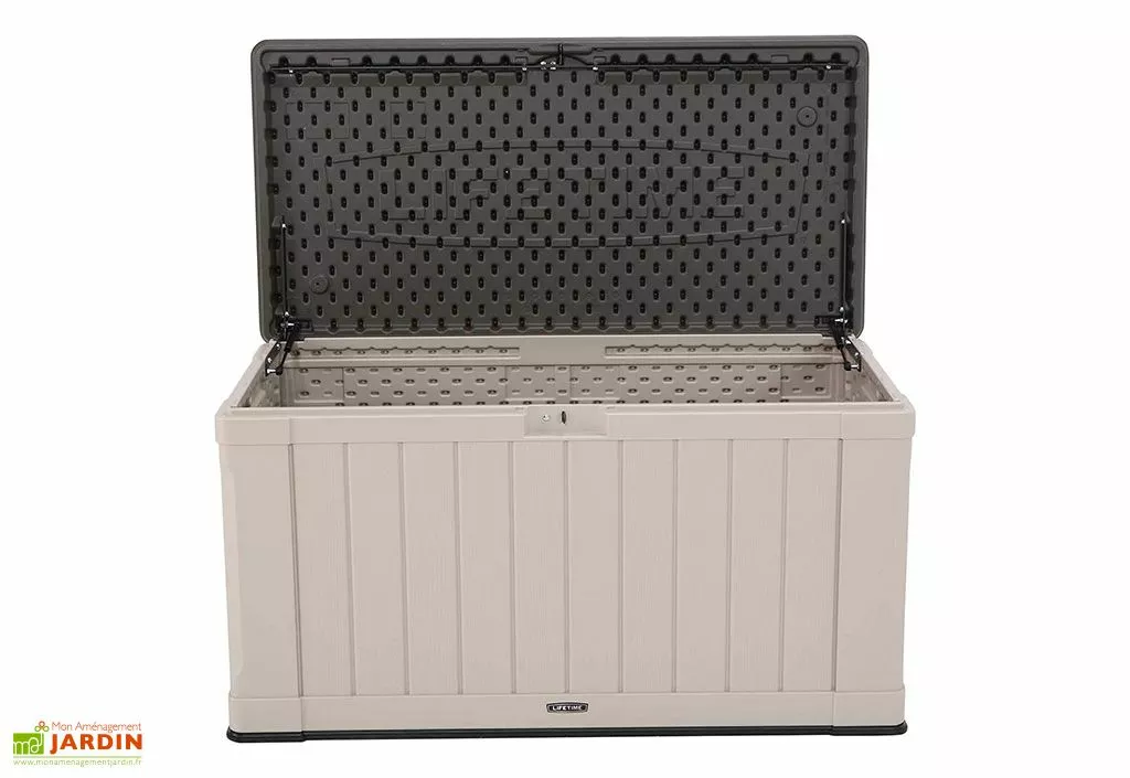 Ce coffre de jardin de chez Lifetime possède une capacité de stockage de 439 L. Il mesure 127,9 cm de long sur 64 cm de large et 67,2 cm de haut et n’occupera donc que peu d’espace dans votre extérieur, ce qui ne l’empêche pas d’offrir suffisamment d’espace pour ranger les coussins de votre salon de jardin, du matériel de jardinage ou les jouets de vos enfants, par exemple.