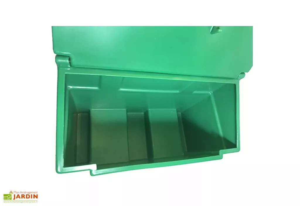 Des clips sont intégrés sur le dessous du couvercle pour y fixer une pelle (non fournie), afin de faciliter le chargement et déchargement du contenu de la caisse.