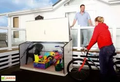 A la fois solide et très stable, ce garage à vélos est conçu à partir de bois de sapin certifié FSC, donc issu de forêts gérées de façon écoresponsable. Il dispose de parois de 14 mm d’épaisseur sur lesquelles repose une toiture quasi plate (pente de toit : 2°) revêtue de feutre comme première couverture (à remplacer ou compléter rapidement après le montage). Notez que le bois n’étant pas traité, il vous faudra le protéger contre l’humidité, les champignons et insectes à l’aide d’un insecticide/fongicide et d’une lasure.