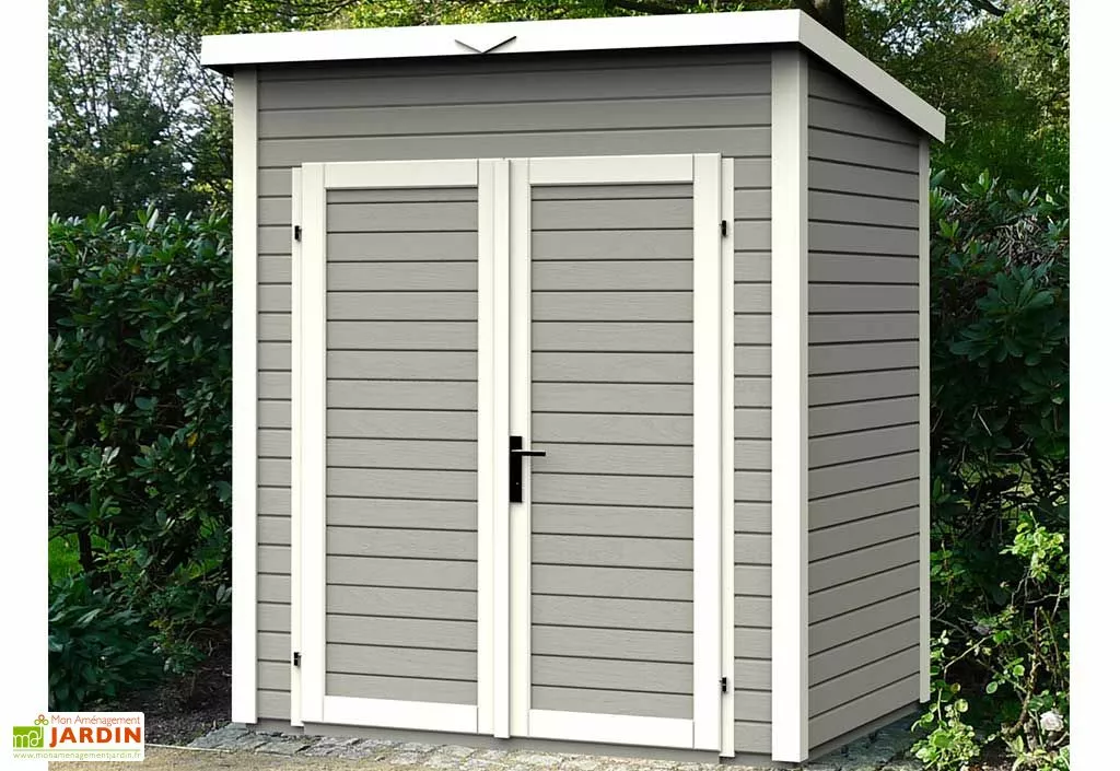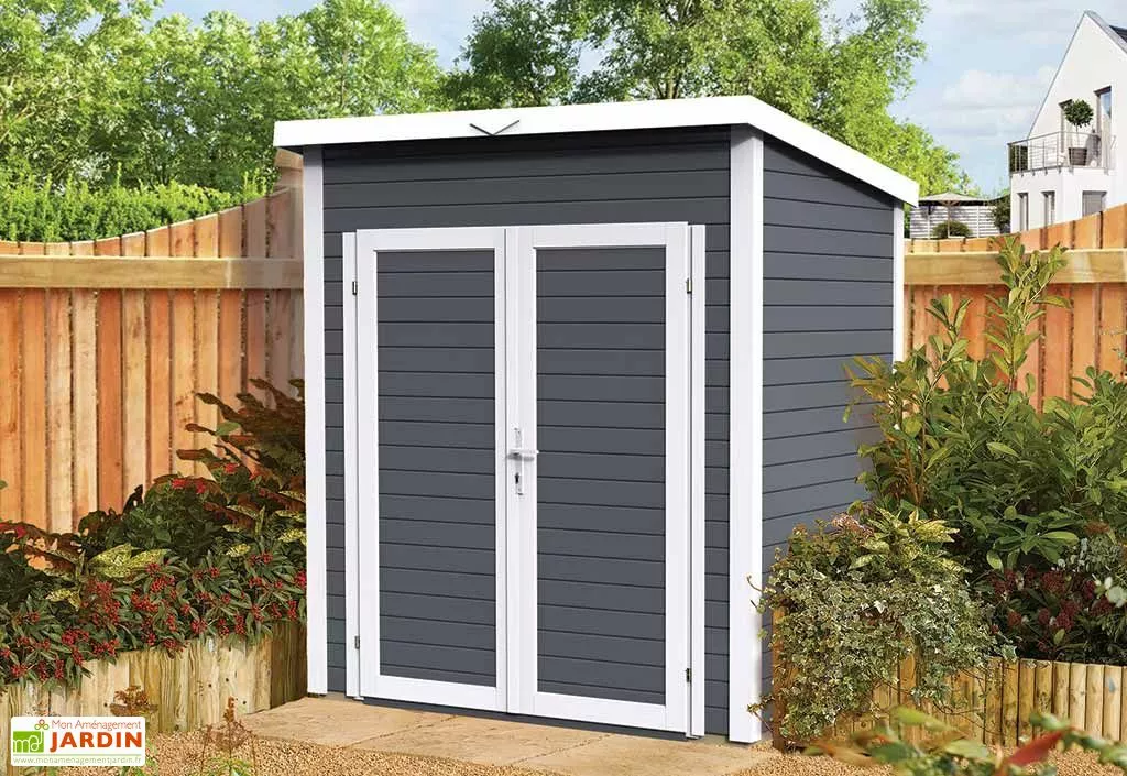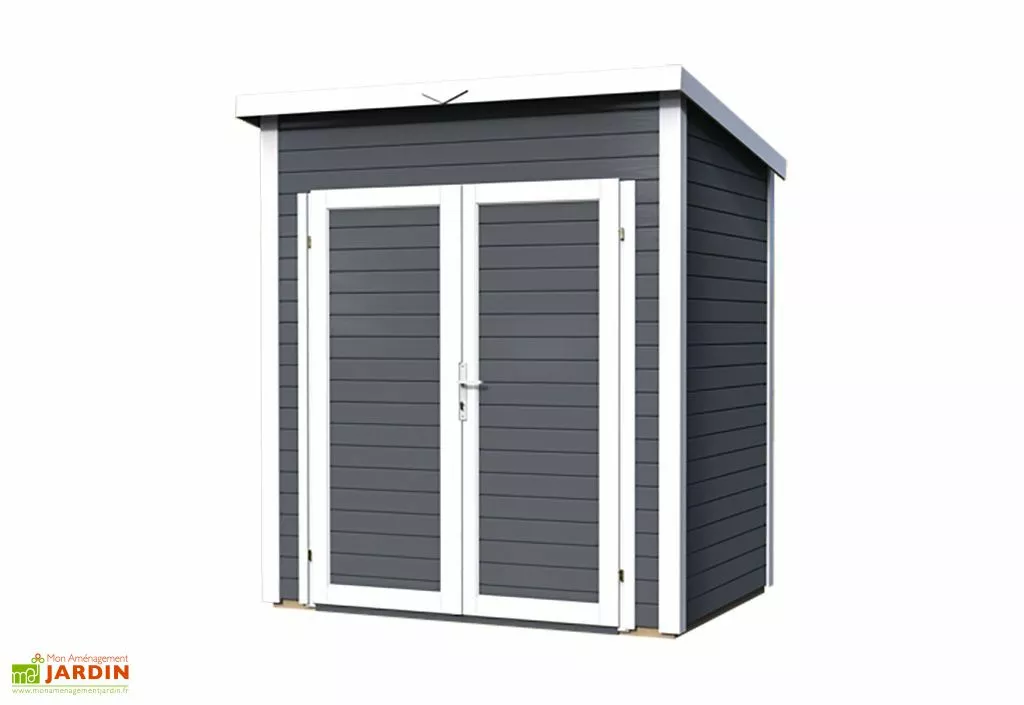 La porte double de l’abri de jardin en bois mesure 134 x 166 cm (l,h) et dispose d’une serrure cylindrique. La pente du toit peut être placée en façade ou à l’arrière. Il existe dans deux coloris : Gris Anthracite ou Gris clair (RAL 7001).