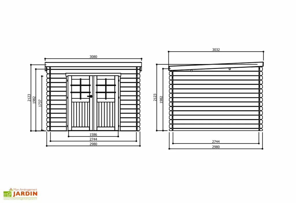 Votre abri en bois est équipé d’une double porte de 158,6 x 173,7 cm (l,h) avec des carreaux en verre trempé. Vous pouvez sécuriser vos affaires grâce à la serrure à clé fournie. Le toit supporte une charge de neige de 75 kg/m2. Votre abri mesure 2,98 x 2,98 m au sol et x 2,16 m de hauteur et il est garanti 2 ans.