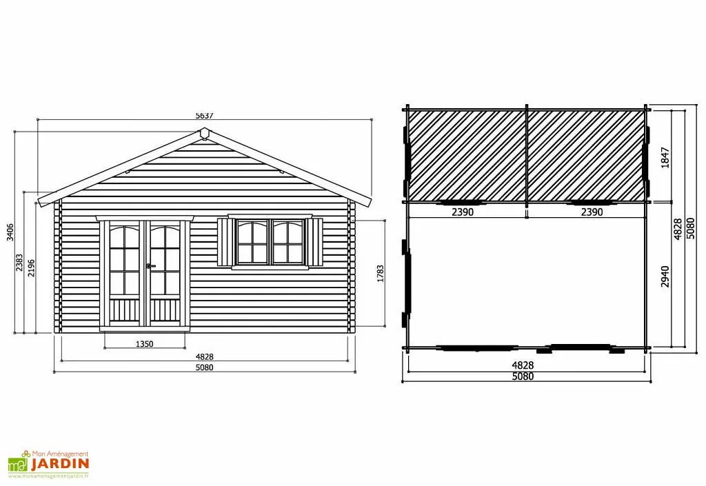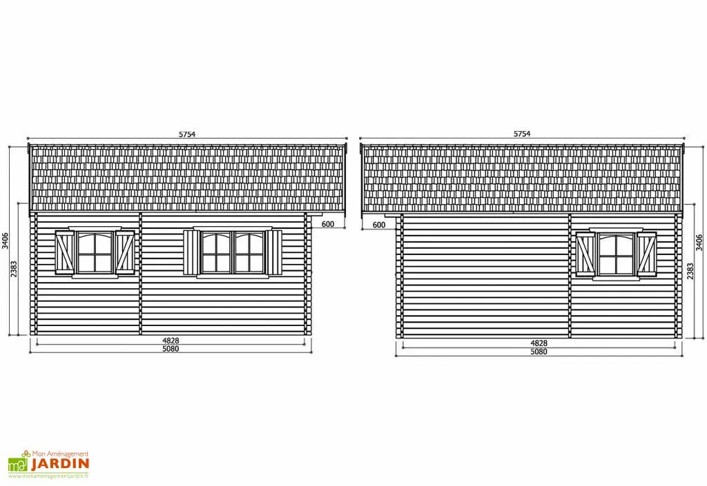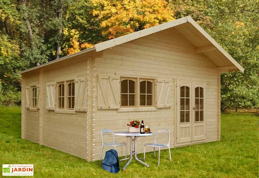 Le chalet a une avancée de toit de 60 cm ce qui donne une surface de 32,44 m² hors tout. Le toit a une inclinaison à 23° et est recouvert de shingles rouges. Vous pourrez, si vous le souhaitez, acheter d’autres bardeaux bitumés verts ou noirs que vous trouverez dans vos accessoires.