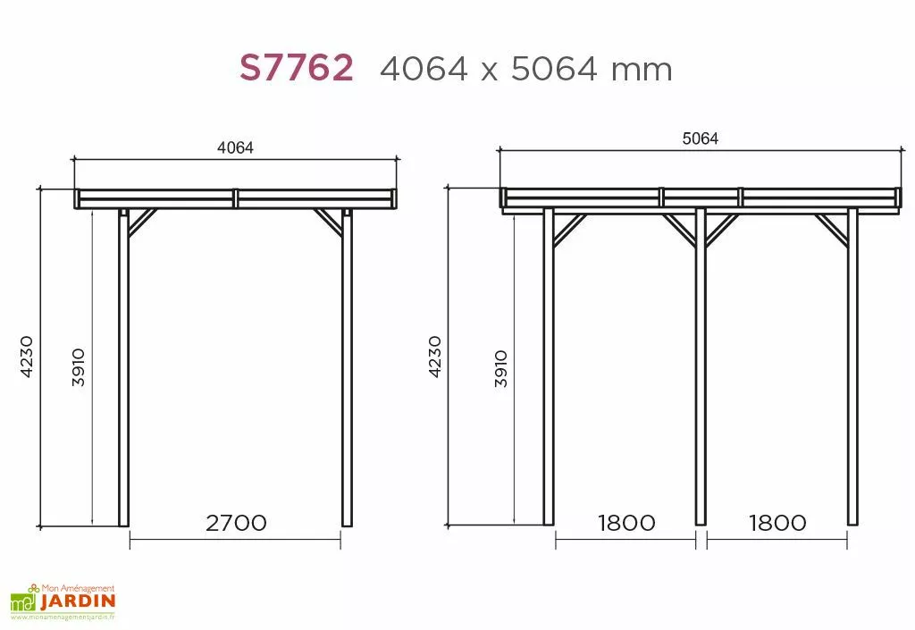 Votre caport de chez Solid est en bois traité autoclave et ne demande aucun entretien. Il mesure 506,4 cm de long, 406,4 cm de large et 425,4 cm de haut, ce qui lui permet d’accueillir un camping-car ou un véhicule utilitaire. Une extension de 2 m de long est disponible dans les « Accessoires » pour créer un carport de 706,4 m de long. La toiture du carport n’est pas comprise. Vous pouvez choisir dans la rubrique « Accessoires » des plaques de PVC ou de métal pour protéger votre carport. Il faudra 8 plaques pour le carport et 4 plaques pour l’extension. La garantie est de 2 ans.