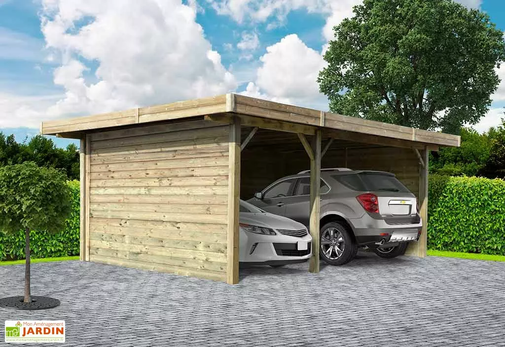 La structure de ce carport, tout comme ses deux parois latérales de 28 mm d’épaisseur, sont fabriquées en bois traité par autoclave. Ce traitement en profondeur est idéal pour les bois destinés à un usage en extérieur. Cela permet en effet de bénéficier d’une excellente protection contre les intempéries, les champignons ou les insectes qui pourraient détériorer le bois.