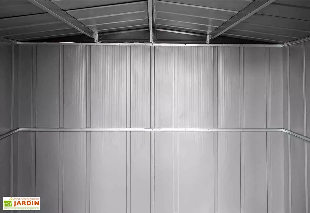 Avec des dimensions extérieures de 3,13 x 2,42 m (largeur x profondeur), cette cabane de jardin en métal occupera une surface de 7,5 m² une fois installée dans votre jardin. Elle offre un espace intérieur quasi identique que vous pourrez mettre à profit pour ranger vos outils, des vélos ou du matériel de jardinage et dans lequel vous pourrez accéder facilement grâce à la présence d’une double porte coulissante de 141 x 152 cm (largeur x hauteur).