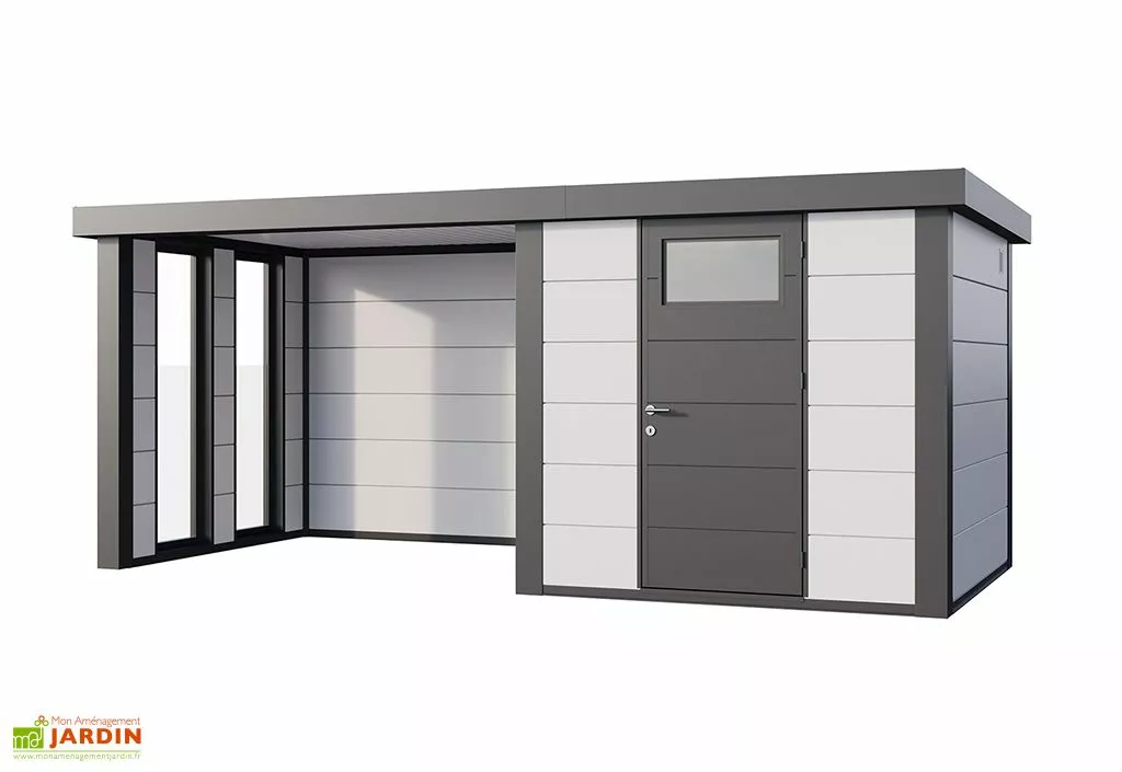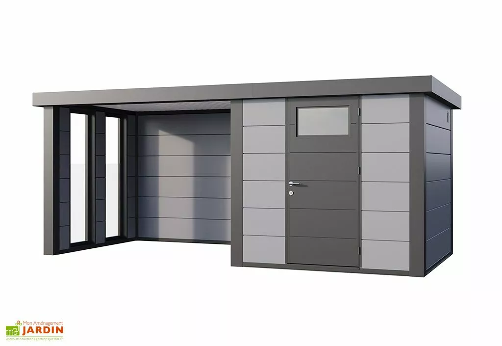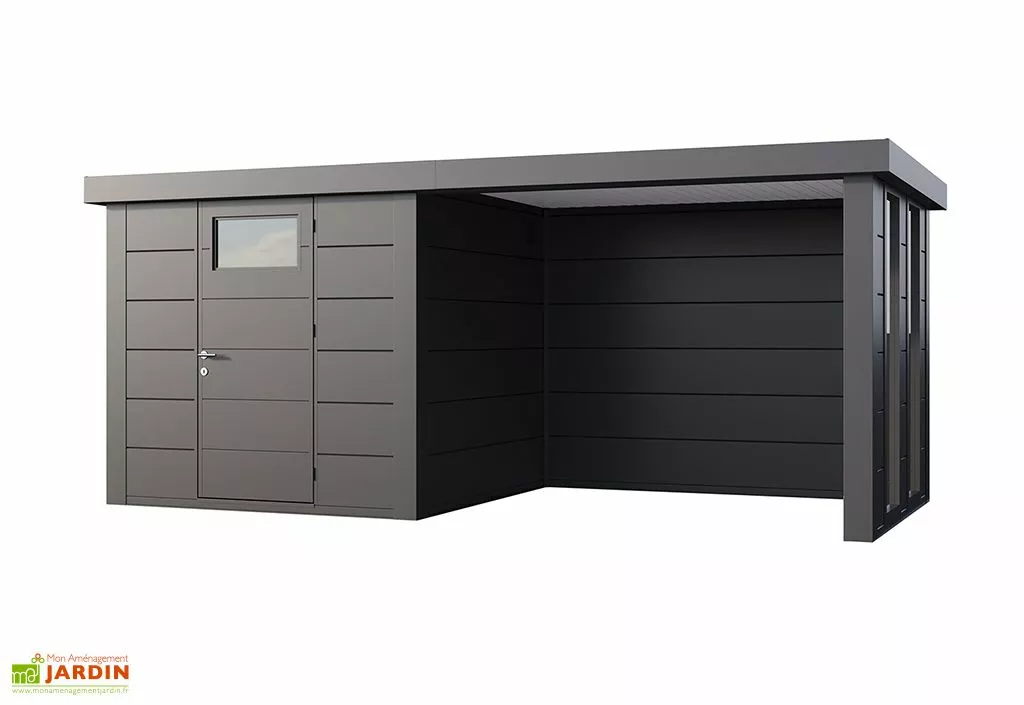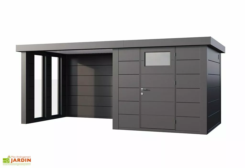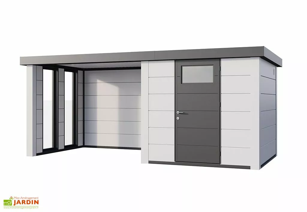 Cette cabane de jardin avec auvent est fabriquée en acier galvanisé, un matériau intéressant car insensible à la corrosion, robuste et résistant aux rayons UV, le tout sans nécessiter d’entretien particulier. Elle possède des parois de 0,9 mm d’épaisseur qui supportent un toit plat (inclinaison : 2°) constitué de panneaux sandwich isolés de 4 cm d’épaisseur. Cette solide toiture pourra supporter une charge de neige de 220 kg/m² et elle intègre une gouttière avec descente.