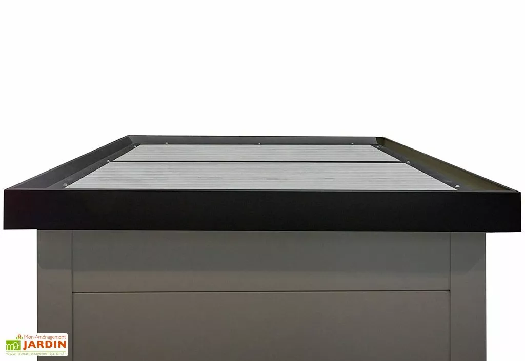 Cette cabane de jardin s’est vue dotée d’une toiture plate (inclinaison du toit : 2°) en panneaux sandwich isolés de 4 cm d’épaisseur. Cette couverture pourra supporter une charge de neige de 220 kg/m² et intègre une gouttière avec descente pour faciliter l’évacuation des eaux pluviales. L’accès à l’intérieur de l’abri se fera grâce à une porte vitrée (verre opalin plexi de 4 mm d’épaisseur) de 87 x 198 cm. Cette porte dispose d’une serrure à barillet et pourra donc être verrouillée afin de sécuriser le contenu de la remise.