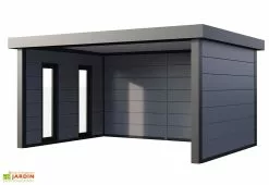 Les parois de cette remise de jardin intègrent des aérations pensées pour éviter le développement de moisissures à l’intérieur et supportent une toiture plate (inclinaison du toit : 2°) composée de panneaux sandwich isolés de 4 cm d’épaisseur. Cette dernière est pourvue d’une gouttière avec descente, pour une évacuation efficace des eaux pluviales pendant une averse. Un plancher en métal est par ailleurs proposé dans l’onglet « Accessoires » si vous souhaitez mieux isoler l’abri de l’humidité émanant du sol ou de la boue.