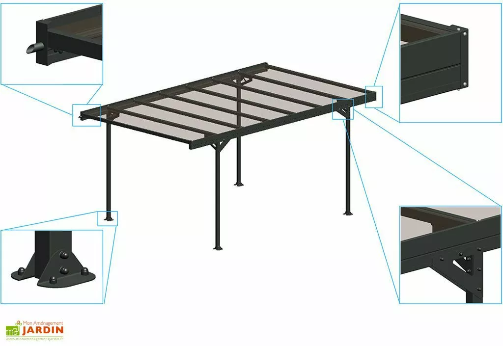 L’abri pour voiture est en métal et constitué de 4 poteaux de section 7 x 5 cm. Il mixe l’aluminium et l’acier traité anti corrosion, des matériaux résistants aux agressions climatiques et qui ne craignent pas la corrosion ni les variations de températures. Le métal est peint en noir RAL 7016 pour un look contemporain. Toute la structure du carport est en aluminium. Seules les pièces de jonction sont en acier traité pour une solidité plus important.