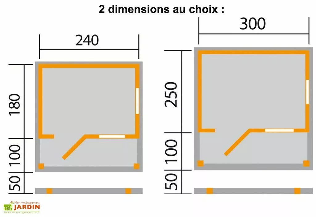 Le chalet en bois existe dans deux dimensions que vous pourrez choisir dans vos options : 180 x 240 x 240 cm (l,l,h) ou 250 x 300 x 240 cm (l,l,h). Le plancher, livré avec l’abri, est en bois massif avec des bords lisses de 20 mm. La sous toiture fait 19 mm d’épaisseur et le toit a un revêtement en bitume.