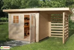 L’abri de jardin existe dans quatre dimensions que vous pourrez choisir dans vos options : 235 x 211 cm avec un appentis de 150 x 211 cm (l,l) – 235 x 240 cm avec un appentis de 150 x 240 cm (l,l) – 295 x 240 cm avec un appentis de 150 x 240 cm (l,l) – 295 x 301 cm avec un appentis de 150 x 301 cm (l,l). L’abri mesure 2,24 m de haut au total et 2,15 m au niveau de la paroi arrière.