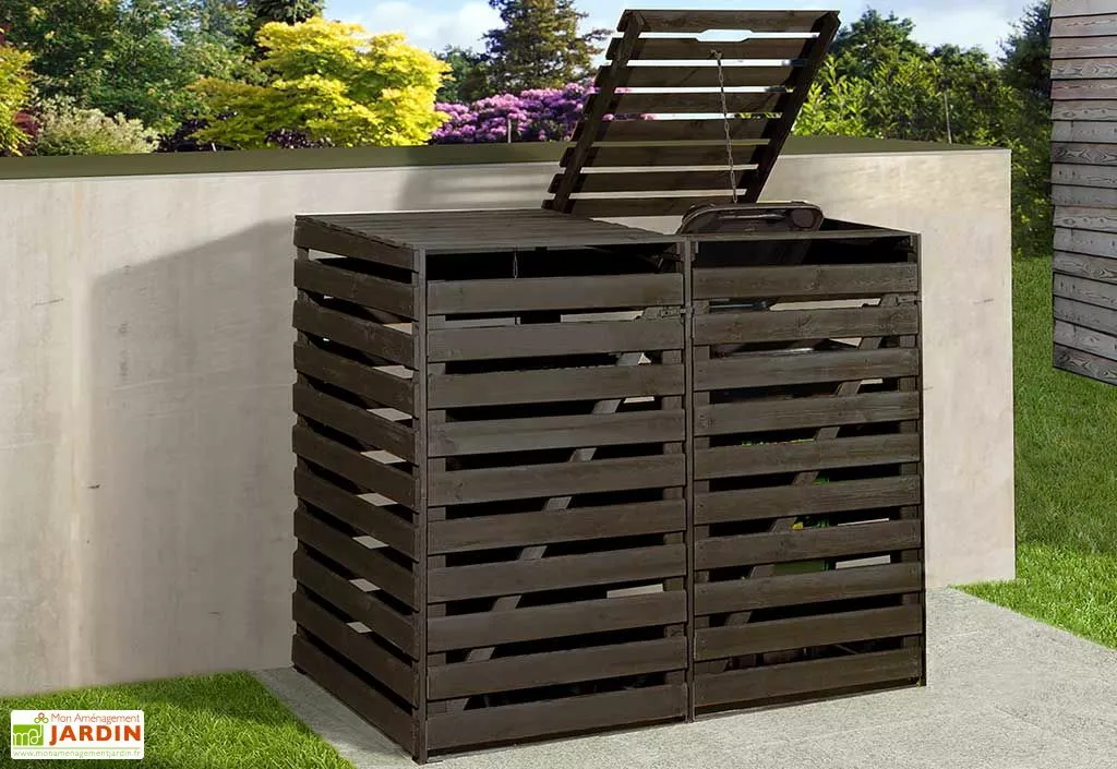 Entièrement fabriqué en bois de pin, ce cache-poubelle profite d’un traitement par imprégnation lui permettant de ne craindre ni l’humidité, ni les insectes et autres champignons qui pourraient le détériorer. Il ne vous demandera donc aucun entretien particulier une fois installé. A noter également, la présence de portes frontales (pour sortir les bennes) et de couvercles avec chaînettes (pour le remplissage).
