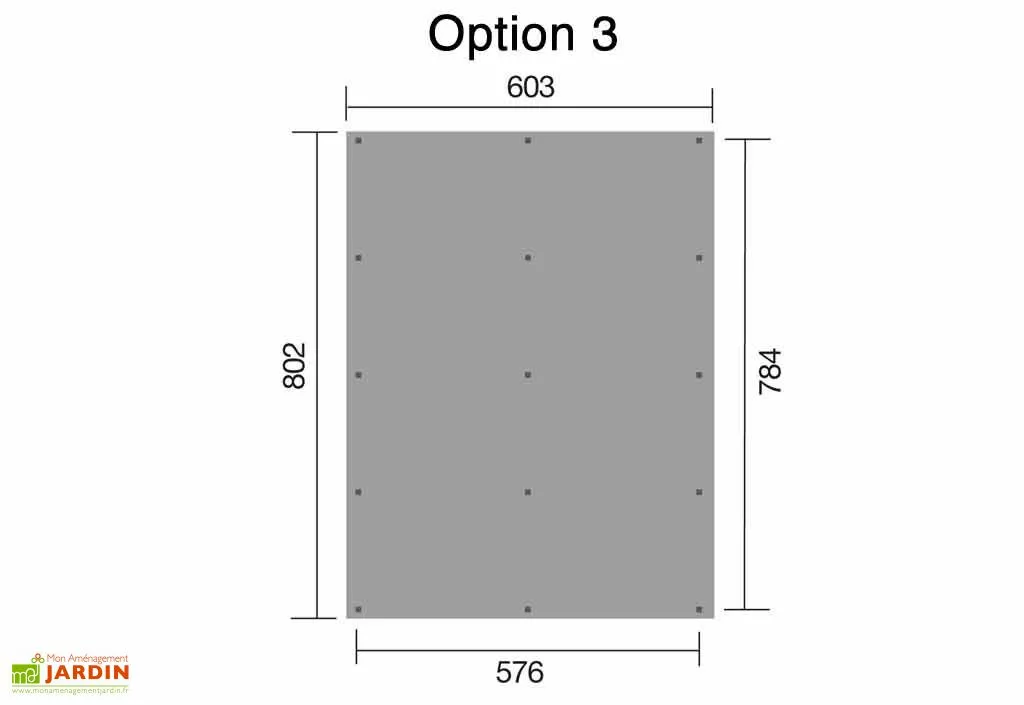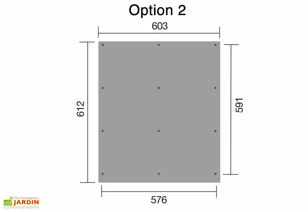 Ce carport Optima Duo a une hauteur de passage de 2,15 m, une largeur de 6,03 m et est disponible en 3 profondeurs, 5,12 m ; 6,12 m ; ou 8,02 m à choisir dans vos options. Il comportera 9, 12 ou 15 poteaux, selon la taille du carport, de sections 120×120 mm. (Les décorations visibles sur la photo ne sont pas livrées avec le carport.)