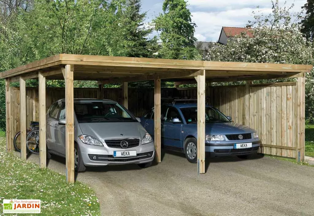 Le carport en bois Optima Duo 2 voitures de chez Weka vous permet de protéger efficacement vos véhicules des intempéries. Il est fabriqué en bois certifié FSC et imprégné autoclave classe 3 de qualité artisanale. Son toit est en PVC gris avec une résistance à la neige de 125 Kg/m².