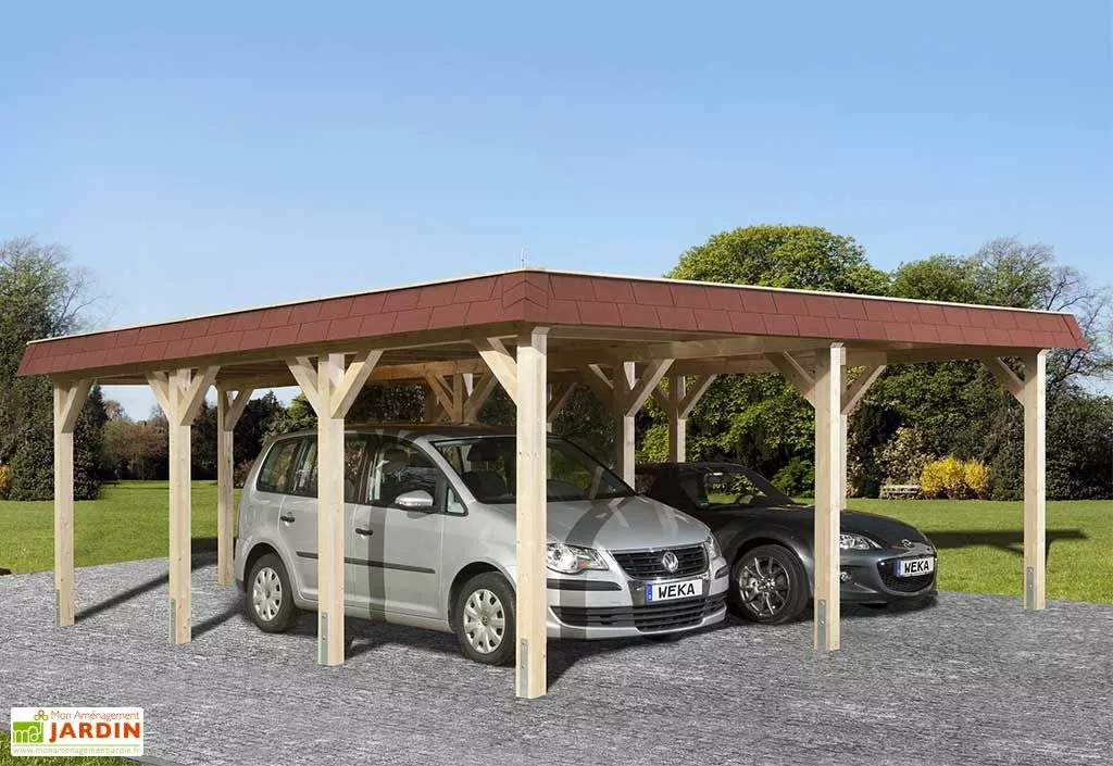 Ce grand carport Weka mesure 6,22 m de large sur 6,39 m de profondeur, soit suffisamment d’espace pour accueillir simultanément deux véhicules (surface couverte : 39,75 m²). Il offre en effet deux espaces de stationnement bien distincts, chacun profitant d’une largeur et d’une hauteur de passage de respectivement 2,70 et 2,09 m. Vous pourrez donc garer vos voitures à l’abri des intempéries, du soleil et d’éventuelles chutes de branches, entre autres.