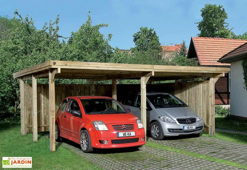 Ce carport double signé Weka associe une solide structure en bois à une toiture en acier galvanisé qui protègera vos véhicules des intempéries, du soleil et de ses rayons UV ou de tout autre élément extérieur qui pourrait les endommager ou les salir. Il couvre une surface totale de 30,87 m² et se divise en deux parties offrant une largeur de passage de 2,70 m chacune (hauteur de passage : 2,15 m). Ce carport conviendra donc pour le stationnement de nombreux modèles de véhicules.