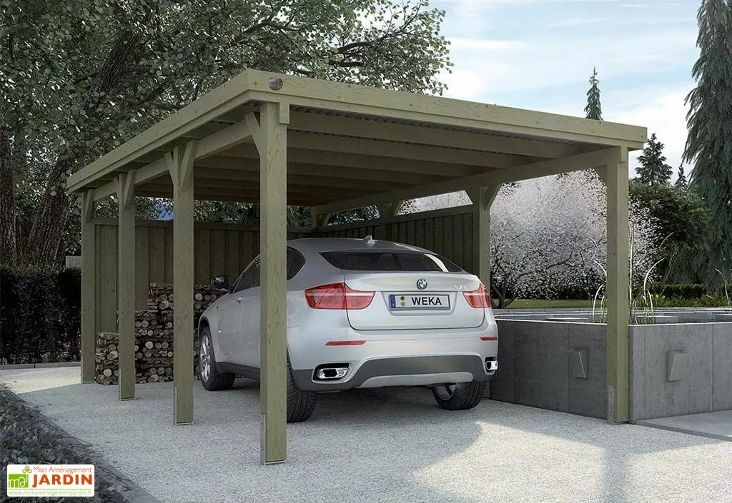 Parfait pour stationner votre voiture à l’abri des intempéries ou autres agressions extérieures, ce carport simple de la marque Weka est doté d’une toiture en acier galvanisé insensible à la rouille. Cette dernière couvre une surface de 20,31 m² et repose sur huit poteaux de 12 x 12 cm de section. Le carport affiche une largeur de passage de 2,70 m et une hauteur de passage de 2,15 m, ce qui le rend compatible avec de nombreux véhicules, voitures comme petites camionnettes.