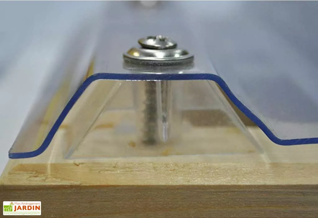 La pergola est soutenue par des poteaux de section 9 x 9 cm. Elle est fixée avec des vis de plombier et rondelles de joint moulées. Des cales d’espacement empêchent la plaque de s’écraser sur la poutre.