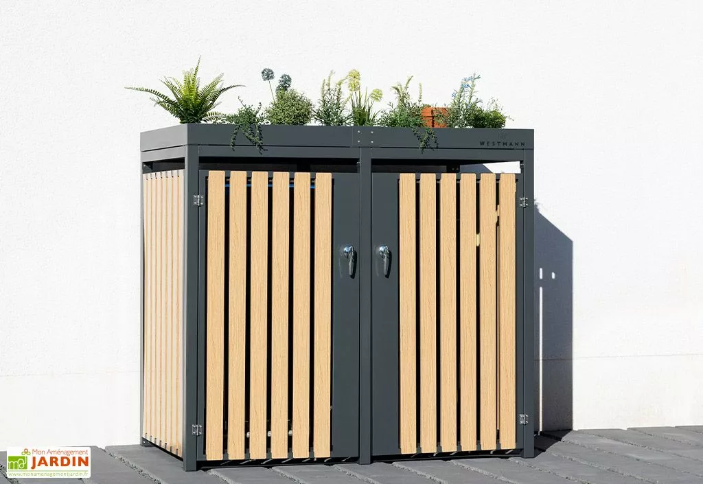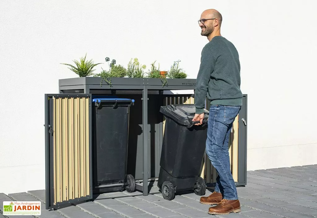 Cet abri poubelle extérieur Westmann mesure 134 cm de longueur, 84 cm de profondeur et 125 cm de hauteur (dimensions intérieures : 133 x 80 x 114 cm) et comprend 2 portes battantes individuelles qui permettront de dissimuler chacune une poubelle de 240 litres. Les poignées sont verrouillables, vous permettant de transformer l’abri en coffre de rangement par exemple. Le seuil bas permet d’entrer et de sortir facilement les 2 poubelles.